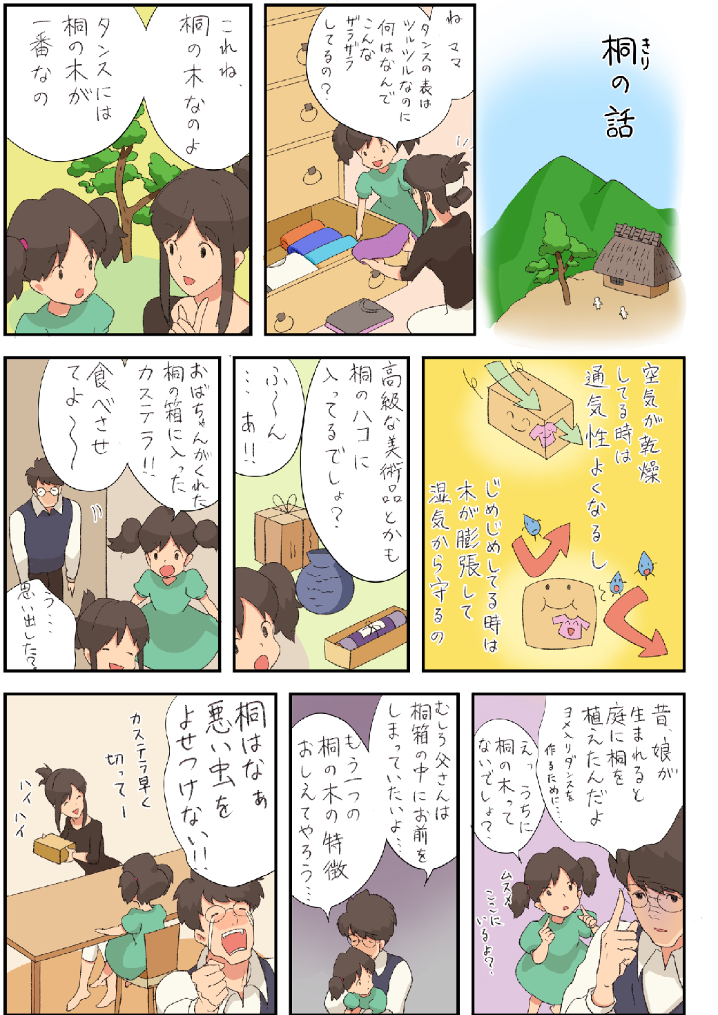 桐は日本の樹木の中で最も軽く、色白で木肌は美しく、狂いが少ないので家を造る際、扱いやすい木材です。熱が伝わりにくい特性をもっており、断熱性が高く、用途としてはタンスや押入など湿気を嫌う場所に使用したり、天井など内張りに使っています。掛け軸など高級貴重品を収納する箱(桐箱)のほか、耐火性が高いので金庫の内装材に利用されるなど、日用品としても幅広く使用し、日本人の生活において身近な木材の一つです。