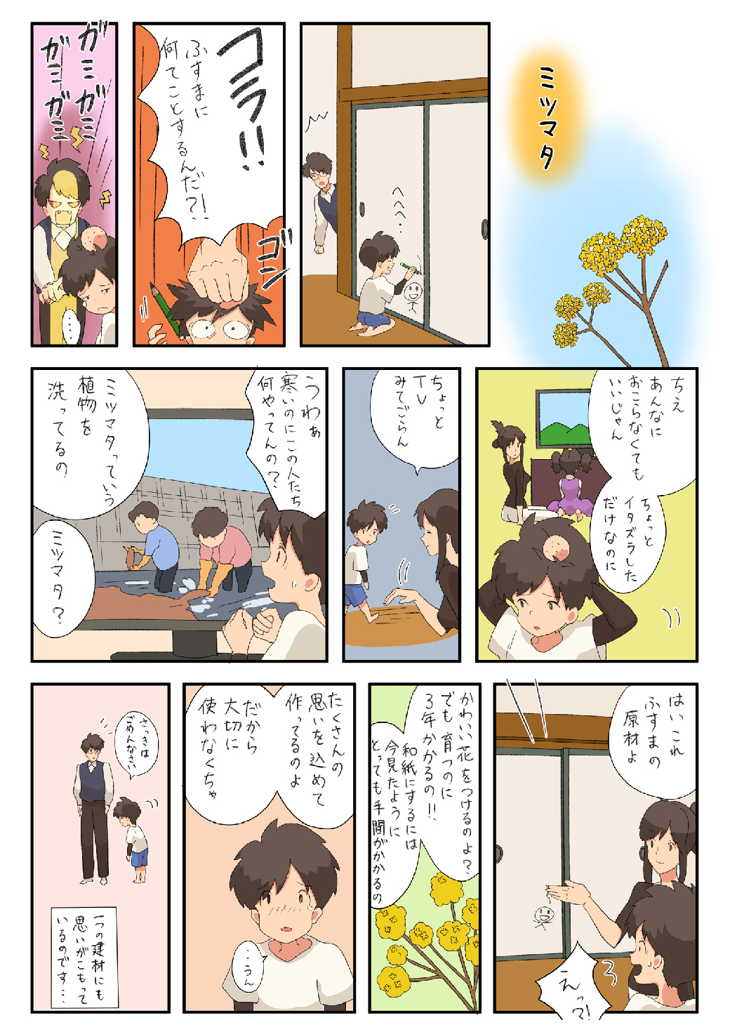 可愛い花を咲かせるだけでなく、樹皮が強靭なところから、良質な製紙原料として、紙幣づくりや襖(ふすま)卒業証書には欠かせないミツマタ。岡山県以外では2県しか生産されていません。毎冬、きれいな川で原料を洗う様子はニュースで見かけますが、実際に襖を使用する家が減ってきています。石油を原料とする建材よりも自然素材を原料とする建材による家づくりをお薦めしています。