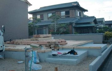 基礎工事を終え、土台を据付け、床組が済んだ現場の後ろに見えるのは、