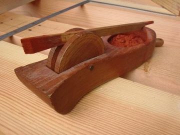 墨壺は木材に直線を引くためのもので、通常、墨汁を染み込ませたものを使い黒い線を引きますが、写真の墨壺は『朱壺(しゅつぼ)』と言い、赤い線を引きます。