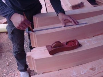刻む際には、墨壺(すみつぼ)、曲尺(さしがね)を駆使して、線を引き刻んでいきます。