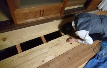 ↑ 畳・座板を剥がし、床下チェックする岡田建築士