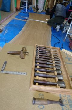 ↑こちらの新築現場では、大工さんが床の間を創るため、大きな欅(ケヤキ)の板と格闘中です!