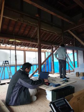 古民再生工事は、新築工事や築年数の浅い建物のリフォームと違い、構造材の大きさが均一でなかったり、丸太のように一定でないため、現場で実物を見ながら計測していく方が間違いのない図面が作成できるからです。