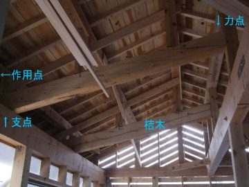 ↑ 桁を中心(支点)にして、左右で天秤のようになって、軒先を吊って支えます。