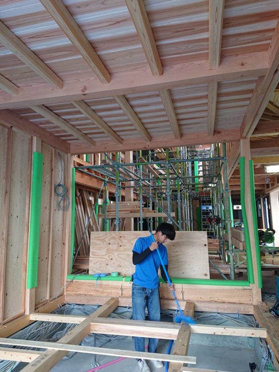 こちらの新築現場では、社員大工の小嶌君が作業が終了するたび、小まめに掃除をしています。