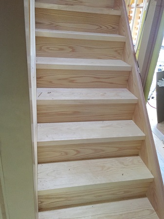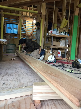 階段材に決まったこの木材を自社にある加工場で加工し、現場に搬入したものを、大工さんが組み、つり込みます。