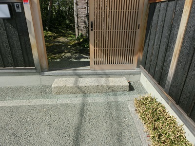 石と土間の天が同じなら踏み外すことはないのでいいのだけれど・・・。石段としては門の端まであったほうがいいですよね。