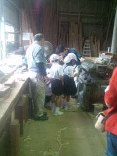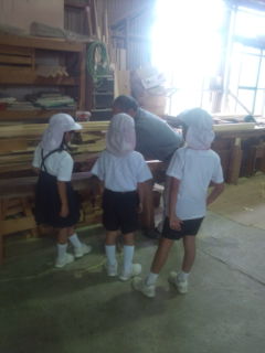 この時期になると、近くの小学校の二年生の郊外授業で、町たんけんと称し、森本工務店にも2グループやって来ました。事務所で、家について説明を受けた後、加工場で木について、勉強、体験してもらっています。