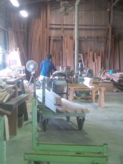 在庫しているヒノキの板から(上の写真)、場所ごとに選別(木取り)し長さをカット。