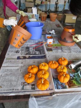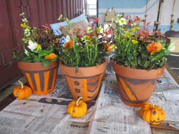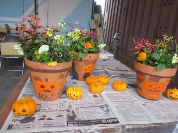 素焼きの鉢にハロウィンカラーのペンキでペイントして、