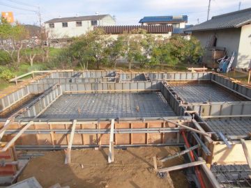↑ 写真は「一体型ベタ基礎」を施工している時の写真です。