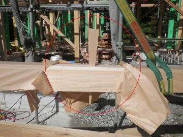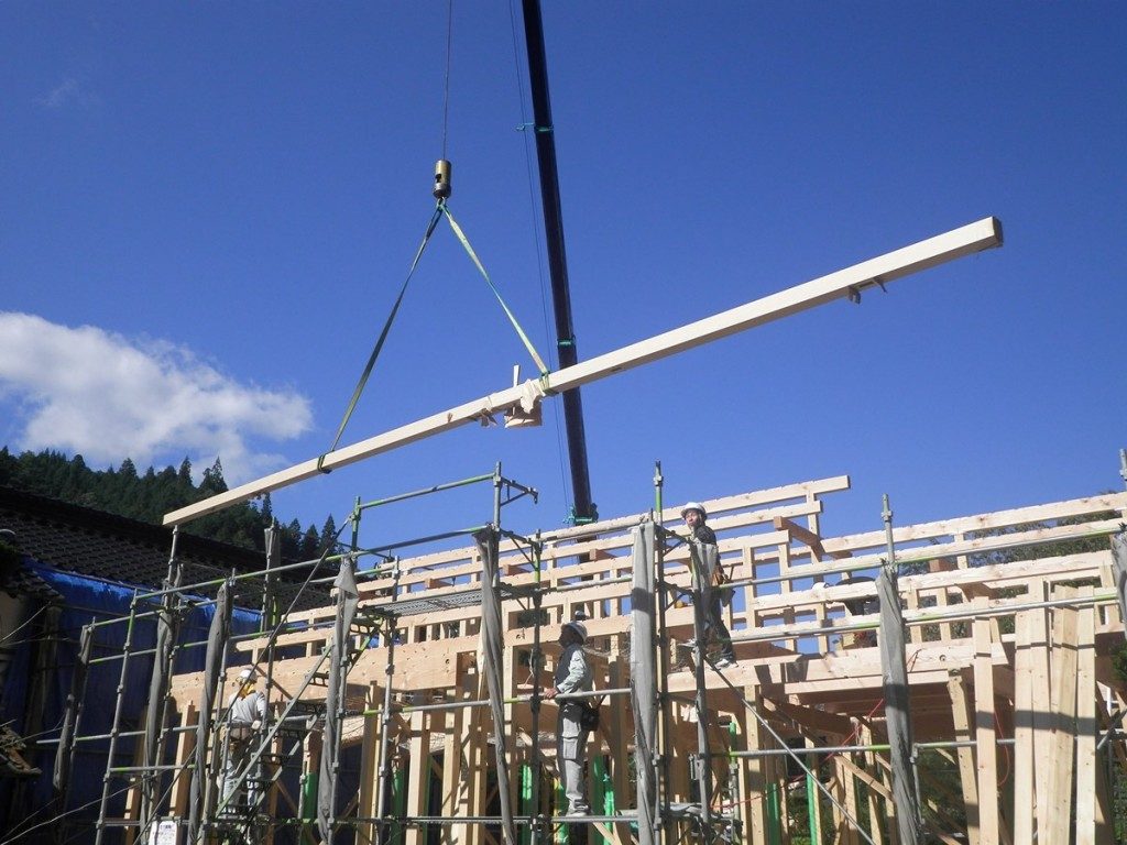 ↓当社の若手社員大工による10メートルの軒桁の継手