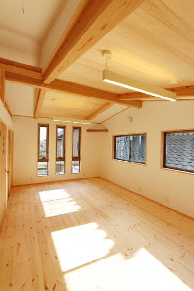 将来、お子様の部屋になる洋室です。勾配天井に板を貼り、開放的で木の香りで癒される空間です。
