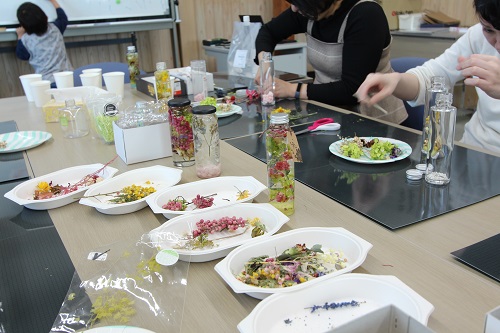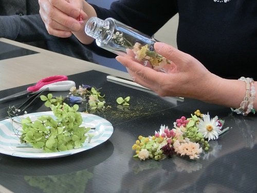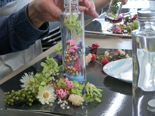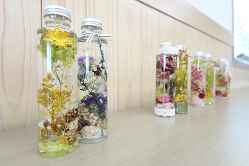 ドライフラワーをビンに詰めてオイル漬けにしたものです。