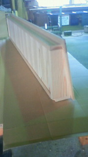 今日は箱庇の組み立てを行いました。箱庇はその名のとおり、箱に組んだ庇です。庇の出の少ないものは加工場で組み立てて現場で大工さんが取り付けます。