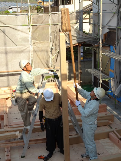 丸い木材が付いている方を上にして垂直に持ち、その状態で上下させることで柱を上からたたくことができます。トントンとよんでいます。