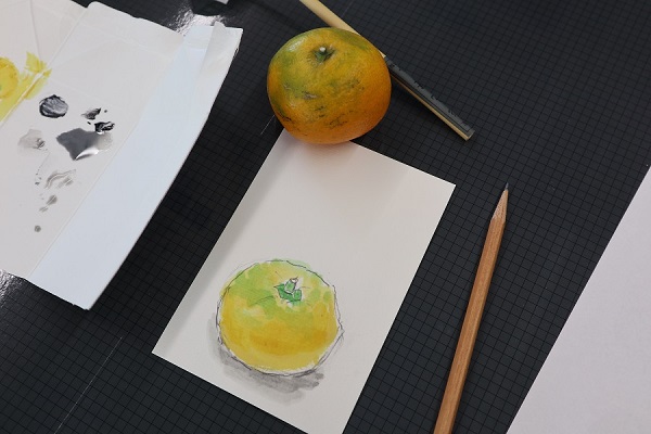 が、、、先生の手にかかれば、顔料といわれる色材を使って立体感とあたたかみのあるみかんに変身。