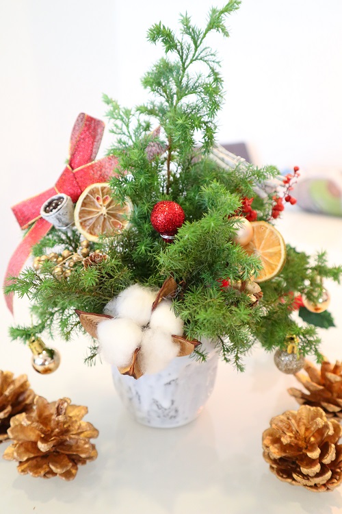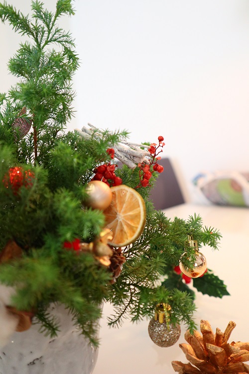 木の実やクリスマスの小物を飾り付けします。棚や机に置ける大きさです。