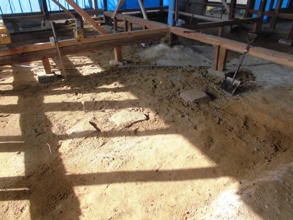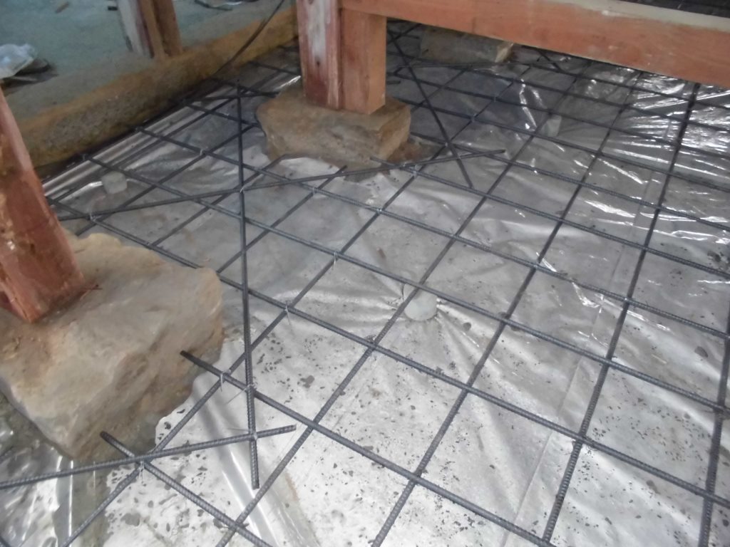 上の写真の状態から、砕石・防湿シートを敷き、鉄筋を組んでいくことにより、湿気が上がってこない強い基礎にしていきます。