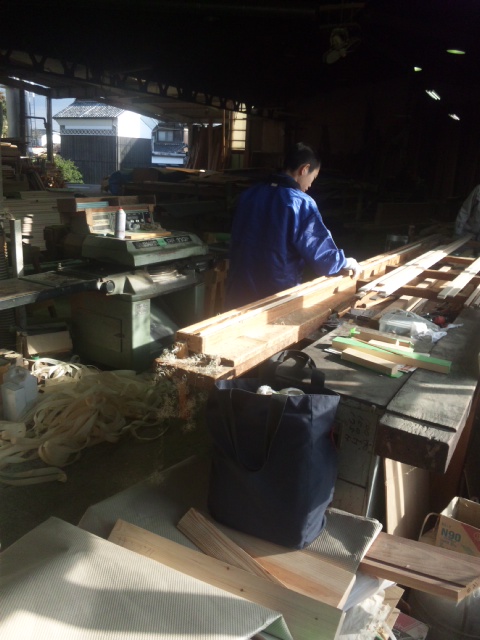 木材の面取り(角をカンナで削って手ざわりを良くすること)と、超仕上げ機(カンナの機械版)を使って廻り縁(天井と壁の角に付く材料)の仕上げと面取りをしてもらいました。