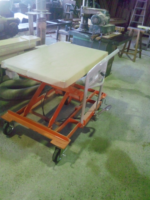 ↑今までの、ライトグリーンの台車では、重い、長い木材を加工機の天盤まで、2人で運んで加工したり、根性(?)で持ち上げたりしていましたが、1人でも、油圧で簡単に加工機の天盤まで持ち上げれるので、楽になりました。
