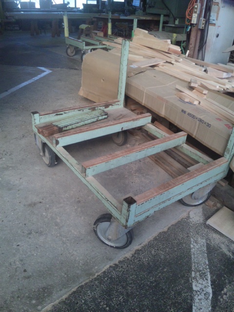 加工場に、新兵器が導入されました。と言っても、昇降機能付きの台車ですが。