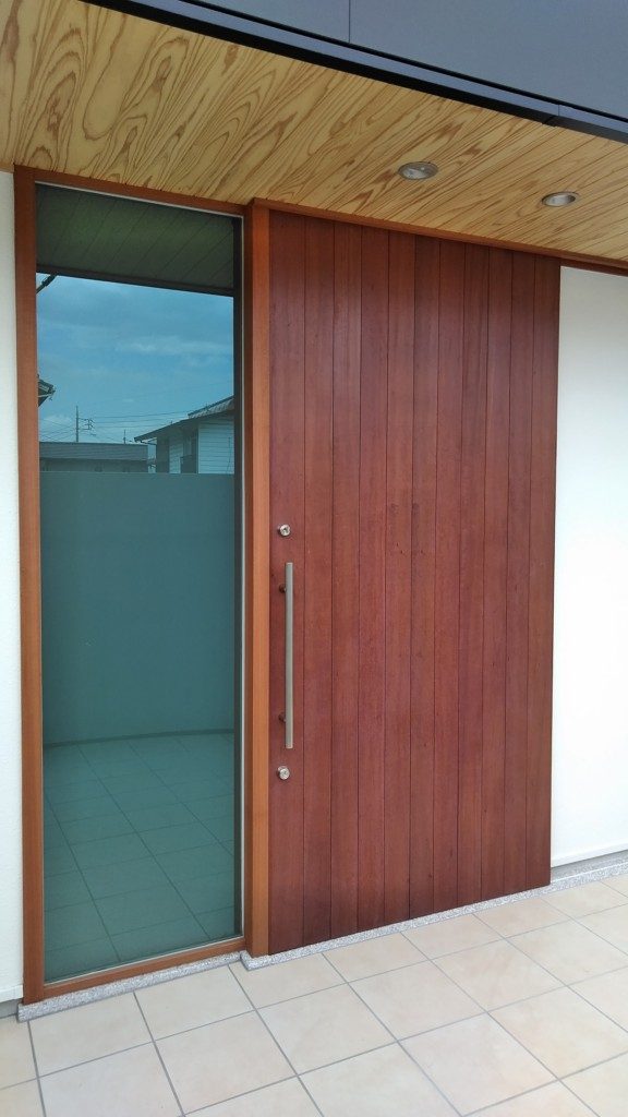 以前、ブログで紹介した木製玄関建具が完成しました。