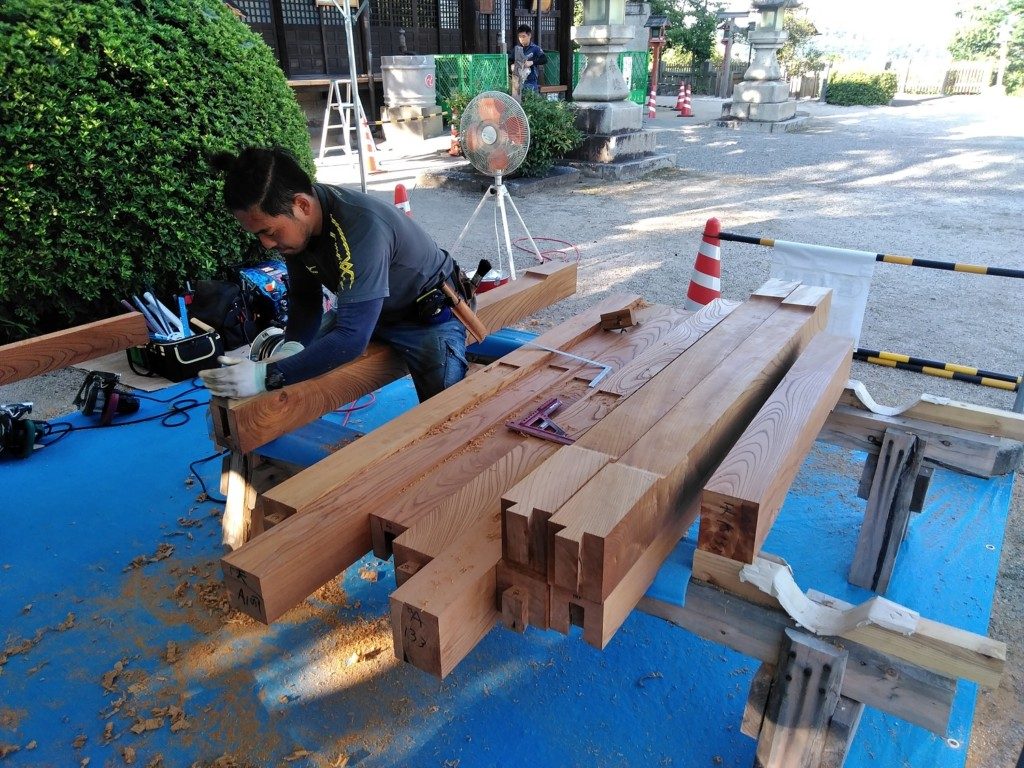 ↓カンナで地覆(じふく)の下端を削り合わせている高羽大工(10年目)