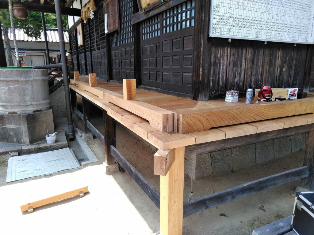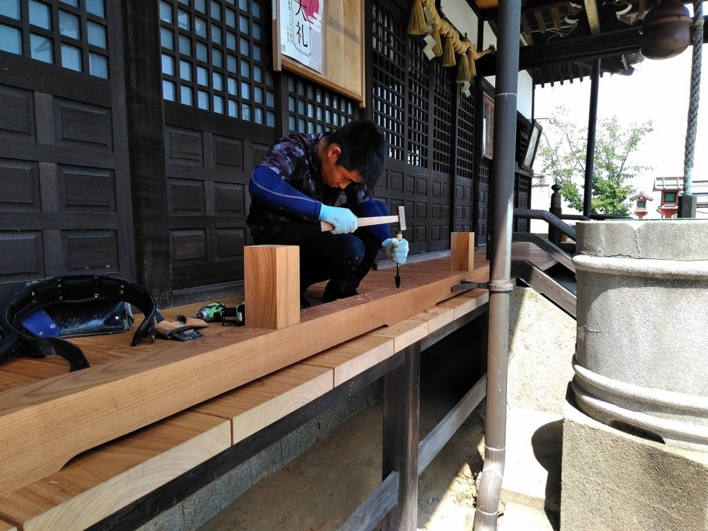 (地覆とは、神社回廊の手すりの一番下に床に接して使われる部材のこと)