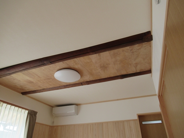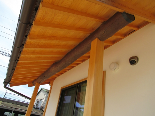 ③縁側の紅梁(こうりょう)はウッドデッキ部屋根の紅梁(こうりょう)として再生。さらに寝室の化粧天井の化粧梁として再生。(④でご紹介)