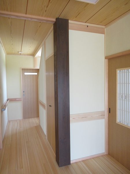 ②大黒柱は玄関正面の大黒柱としてみごとに再生(たくさんの傷跡の処理が大変でした)