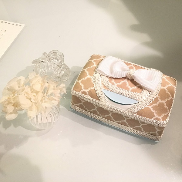 ウェットティッシュケースに、可愛い布とブレード(レース状になった紐)を針・糸一切使わず、本体に貼って作成。