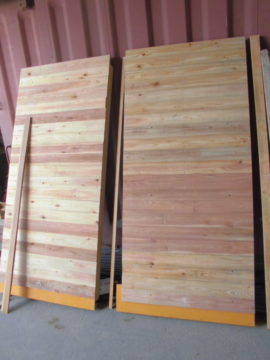 ②その表面に十分に乾燥させた幅9㎝の杉の板を貼りつけていきます。