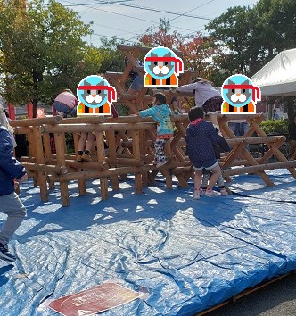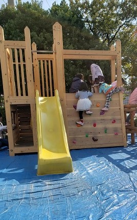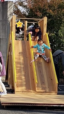 子どもたちの大好きな木の遊具があり、ジャングルジムに上ったり、階段ではなく、