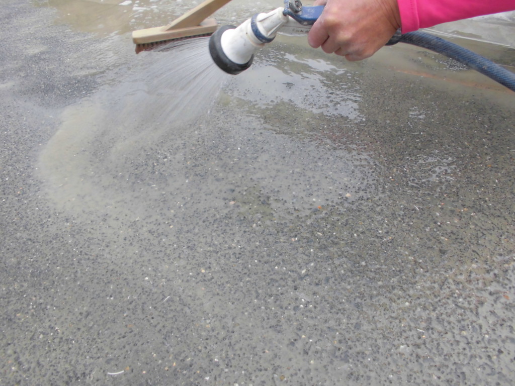 コンクリートの乾き具合を確認しながら水をかけ、表面のノロ(セメントペースト)を