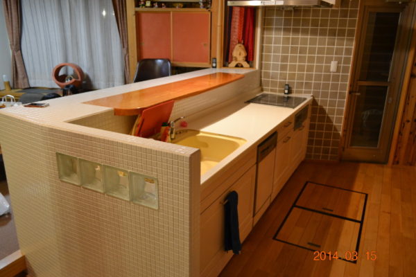 キッチンのフロアキャビネットをタイル張りにすることで和風を演出できます。