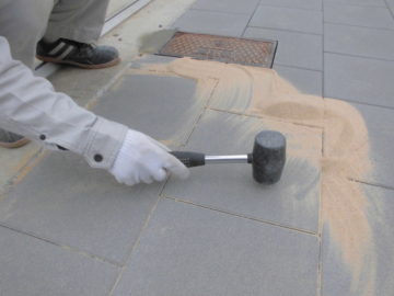 を敷き、インターロッキングブロック(厚さ6センチ)をハンマーでたたきながら敷いていきます。