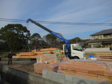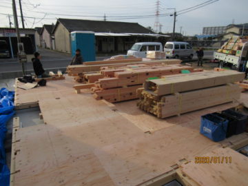 構造材料搬入。20数年前までは、土台敷の状態で上棟を実施していましたが、