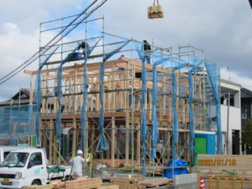 次は、一階の屋根梁・二階床梁の組み込みにうつります。
