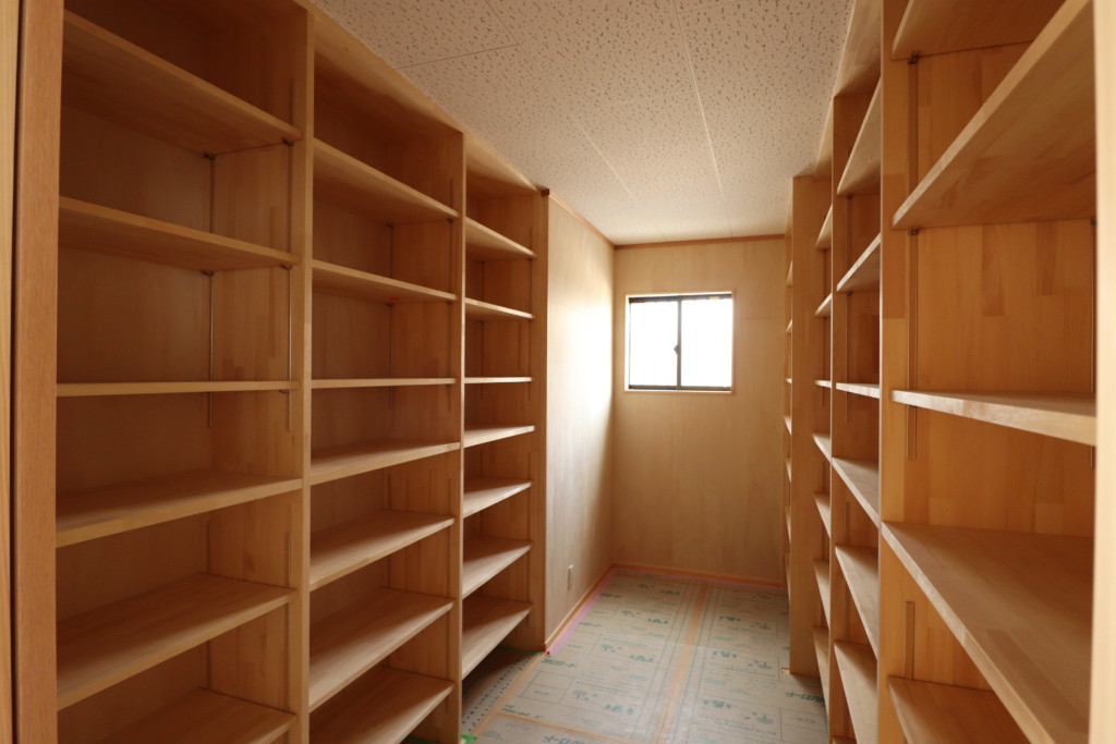 3)納戸・パントリーの両面壁に奥行の違うオープン棚を。