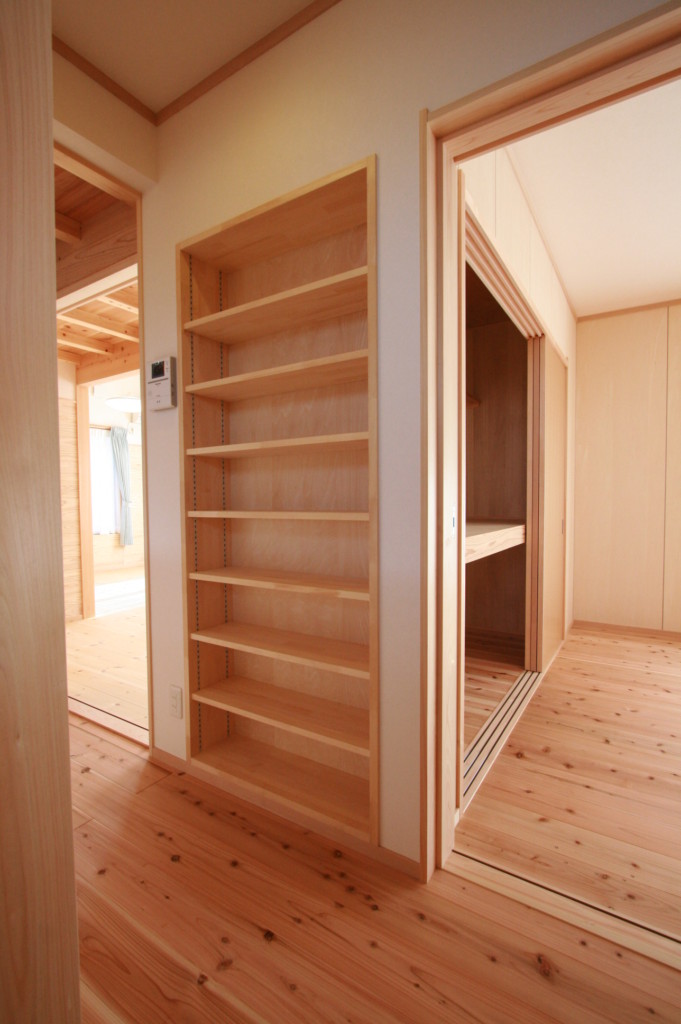 前例と同様に、押し入れ側に壁の厚さを利用した本棚。