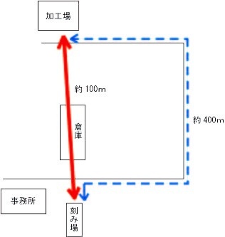 加工場と刻み場は、直線では100mくらいなのですが、