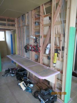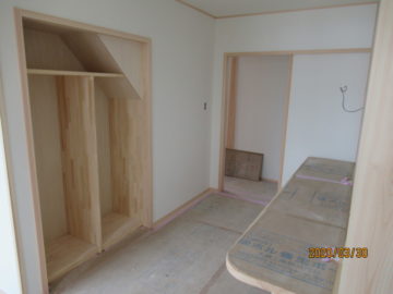 クロス貼り工事が完了し、階段下を利用した収納棚も完了直前、