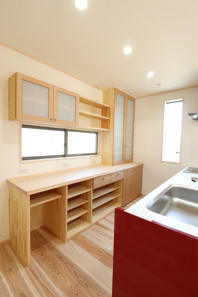 奥様こだわりのキッチン収納。収納品に応じて建具付とオープン棚にして、