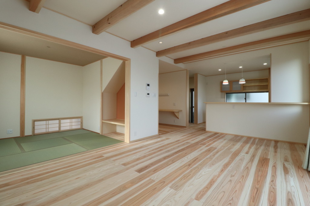 天然杉にこだわって、天井化粧梁・腰板・厚30㎜のフローリング。