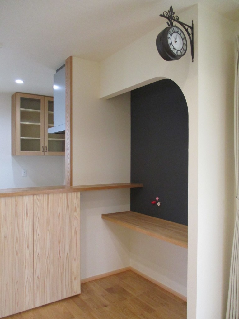 机を造り付け、前の壁を【磁石がつく黒板クロス】にしました。