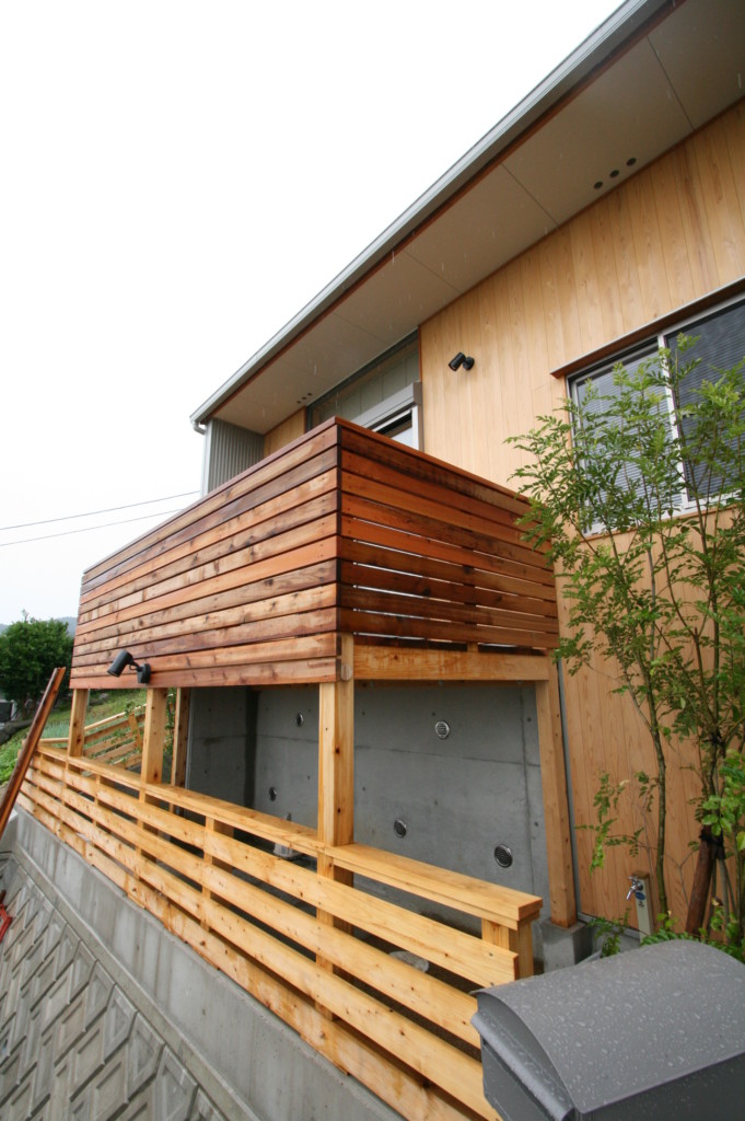 中二階構造でバルコニー風の、高床式でのデッキも、