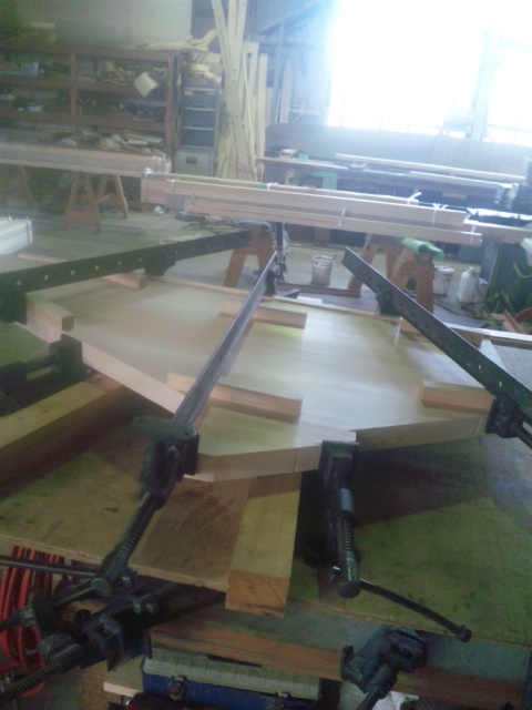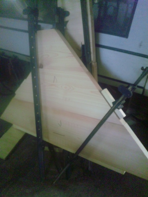 写真のように、回り階段の材料を接着し、ハタガネで固定します。
