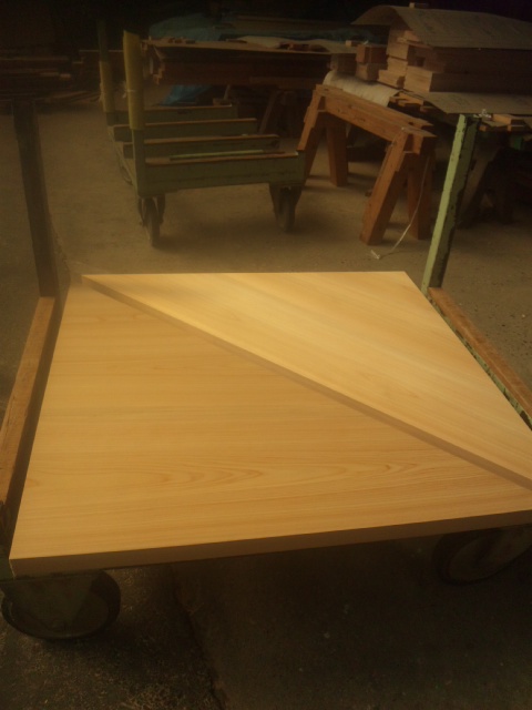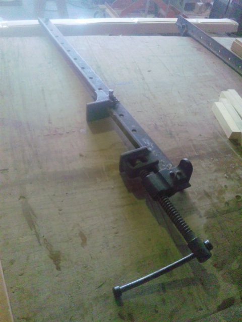 加工場で幅の広い板(例えば、階段の回り部分など)が必要な時、木材を貼り合わせる時に使う道具がハタガネです。